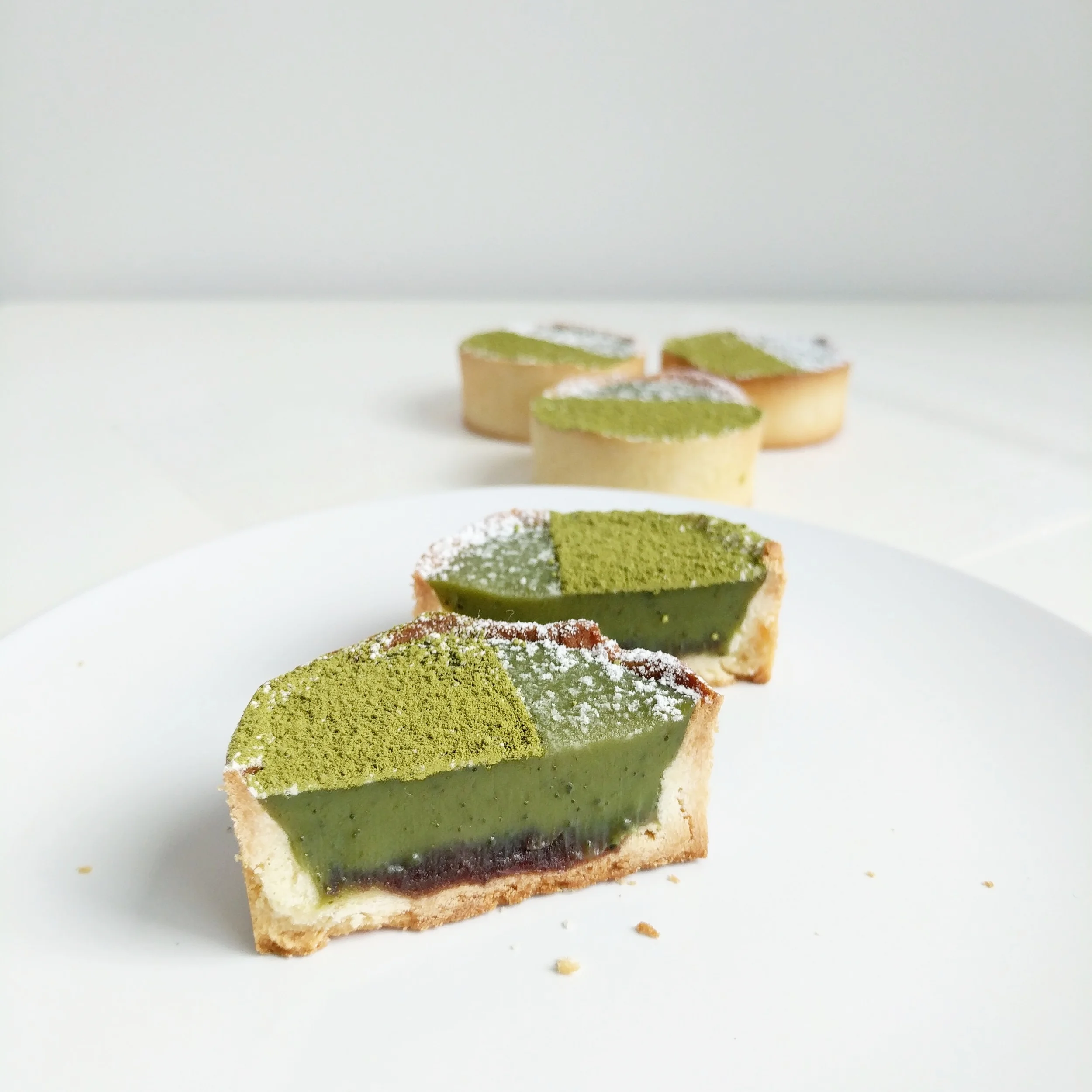 matcha tart, red bean paste, matcha powder & icing sugar for decoration